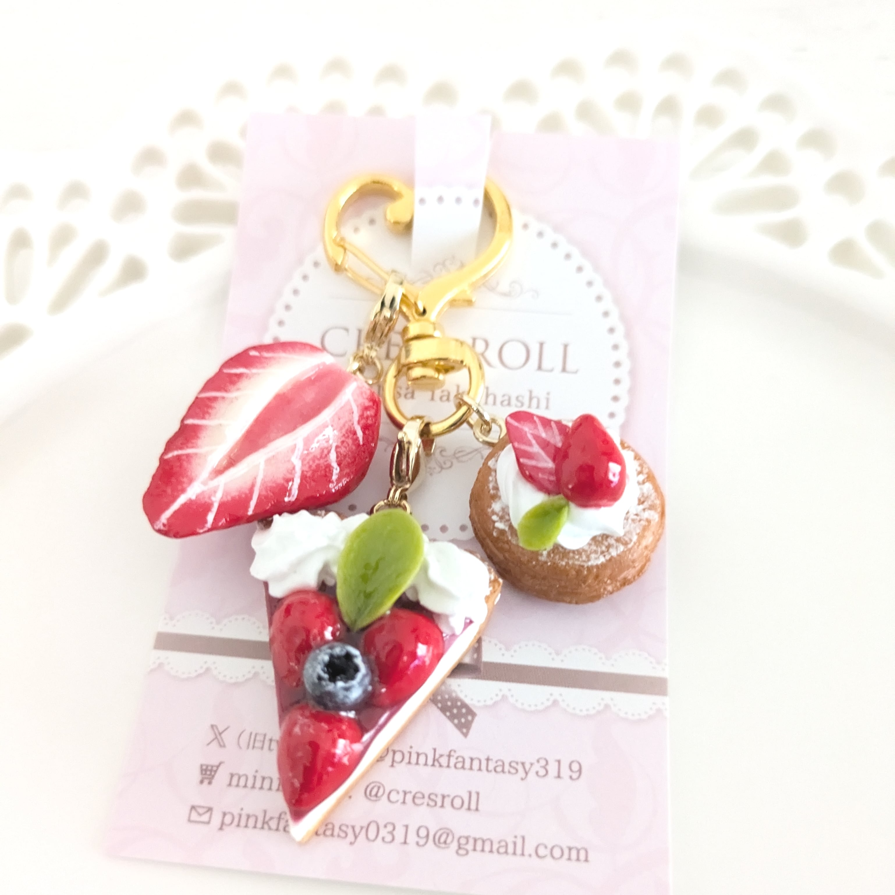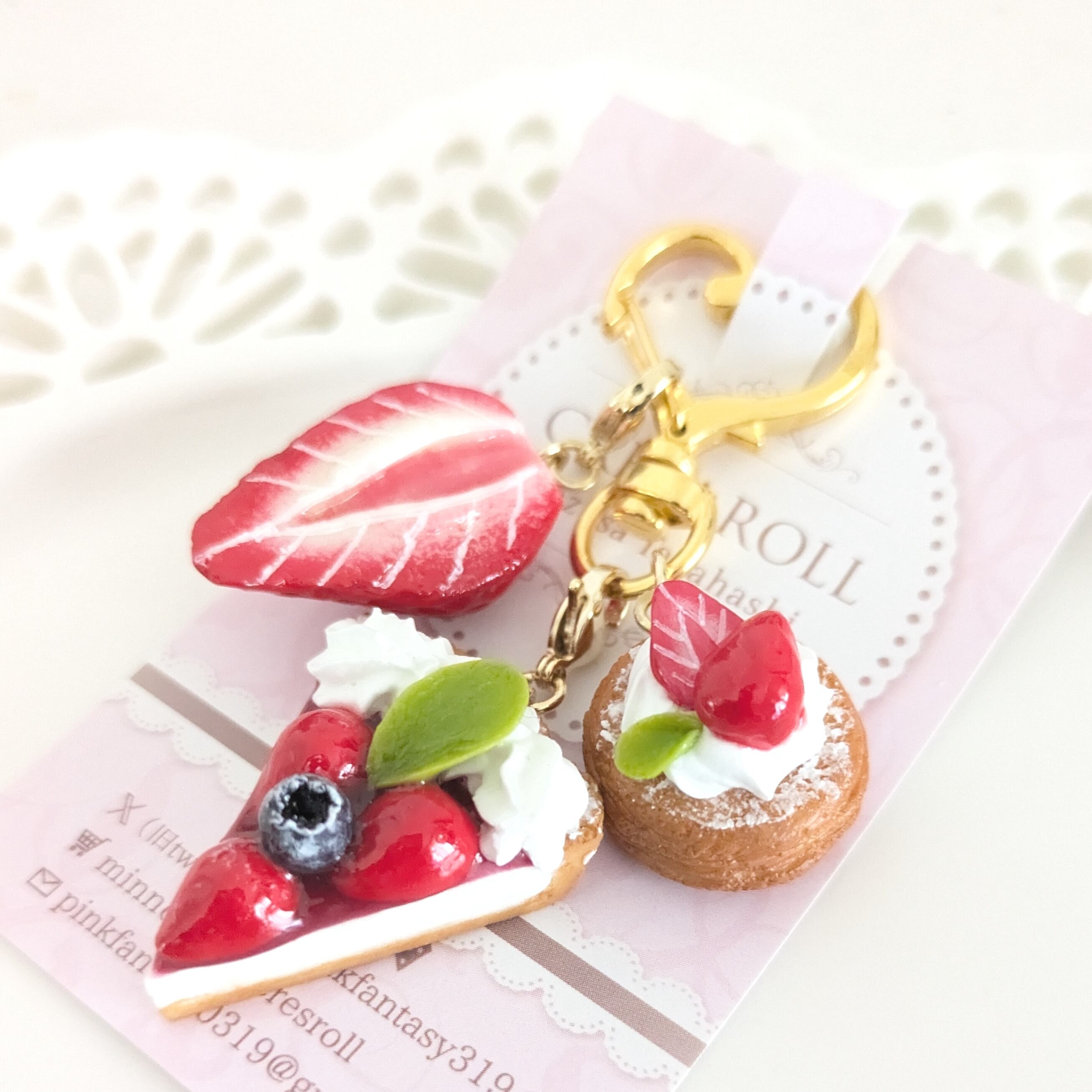 半割りいちご、いちごと生クリームのせのいちごデニッシュ、いちごのタルトの甘い組み合わせのキーホルダーになります。