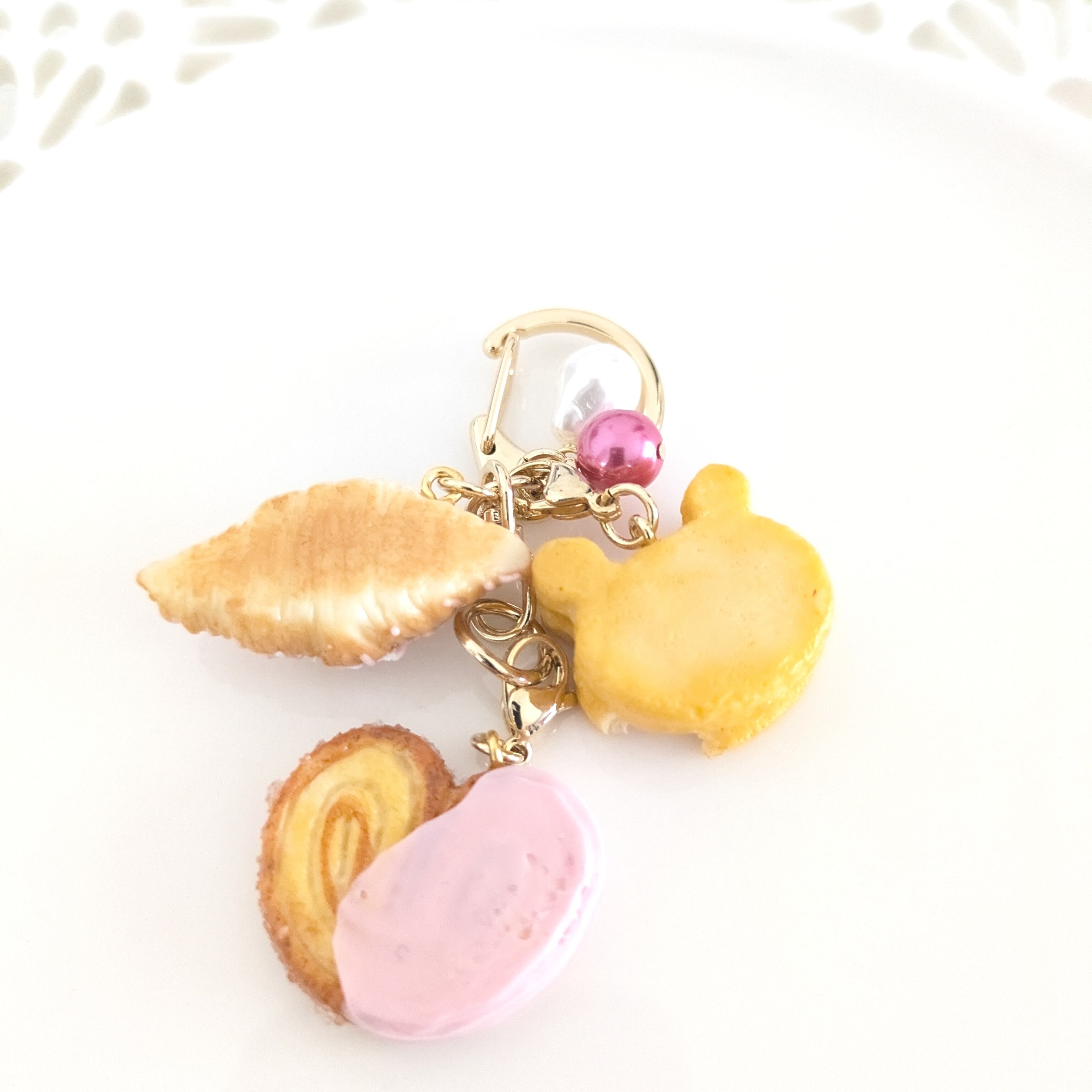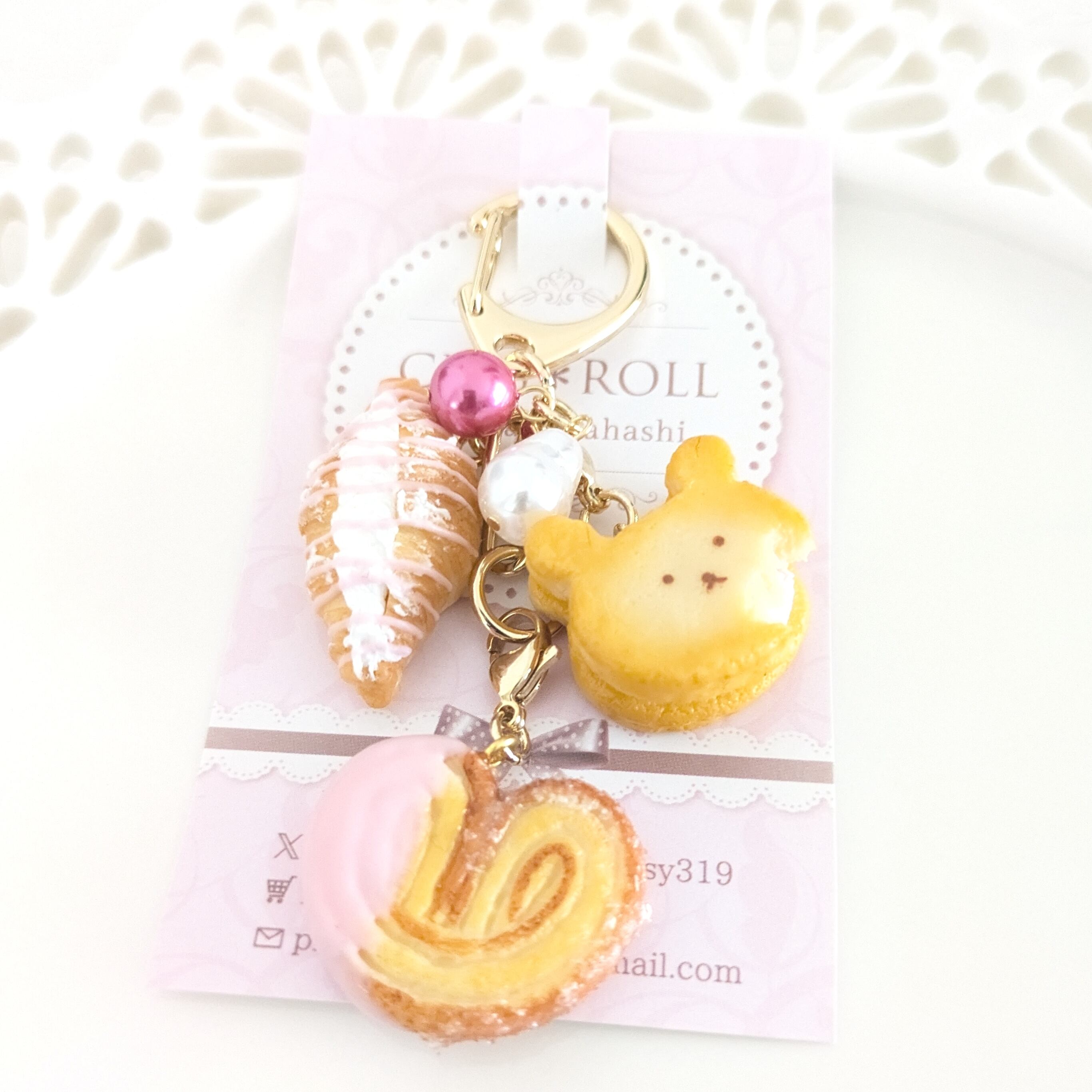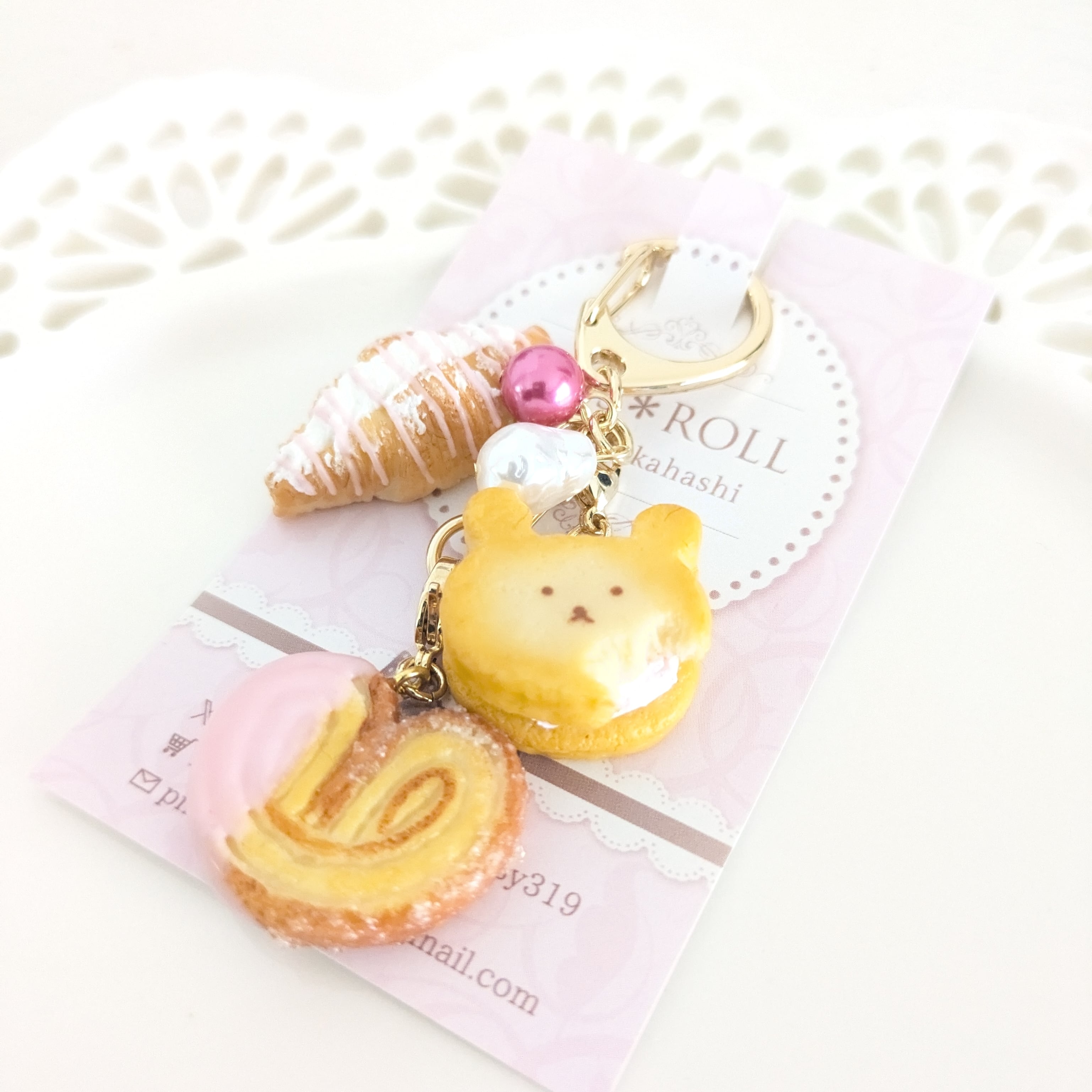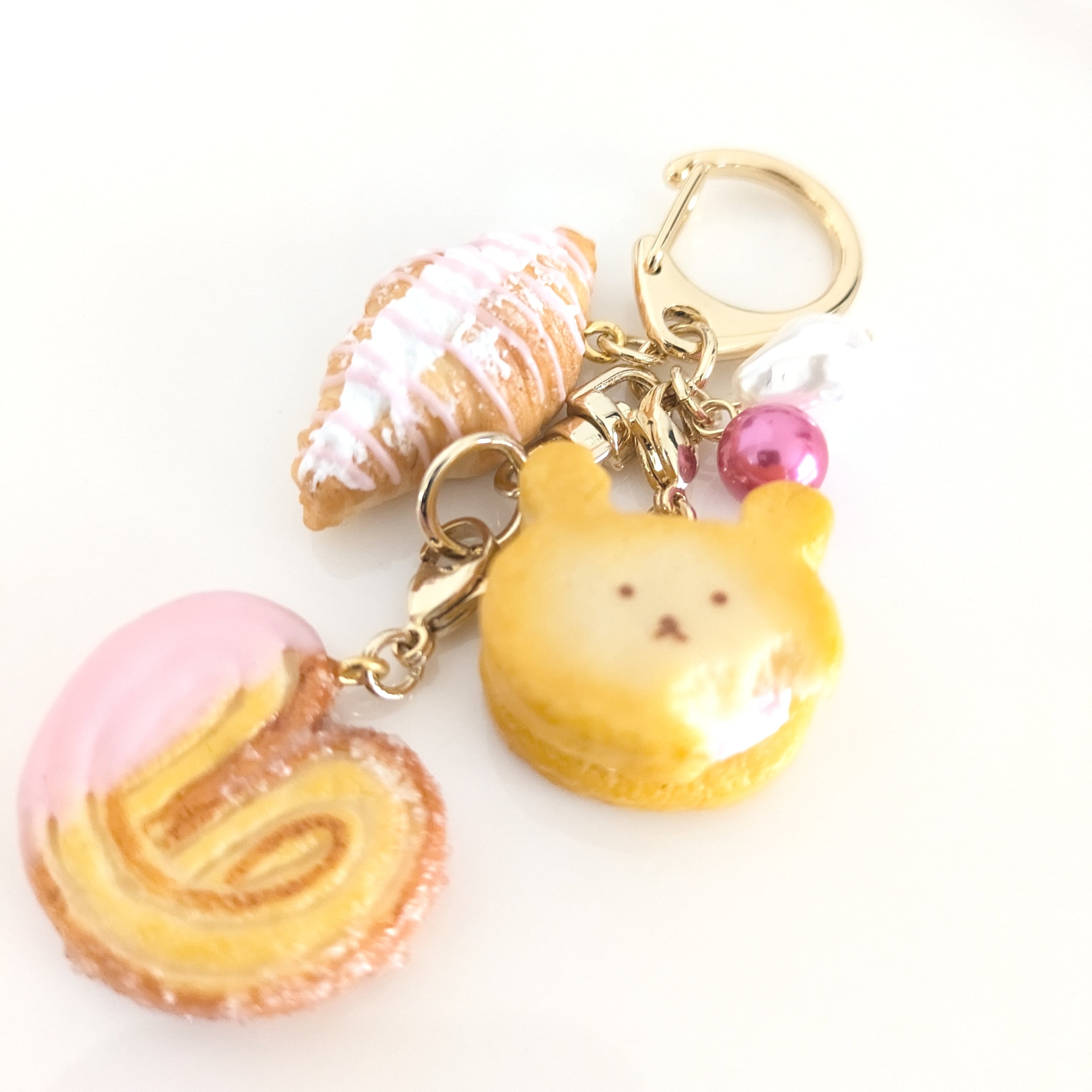 いちごクリームを挟んだくまビスケットサンド、いちごクロワッサンサンド、サクサクのいちごパルミエの甘い組み合わせのキーホルダーになります。